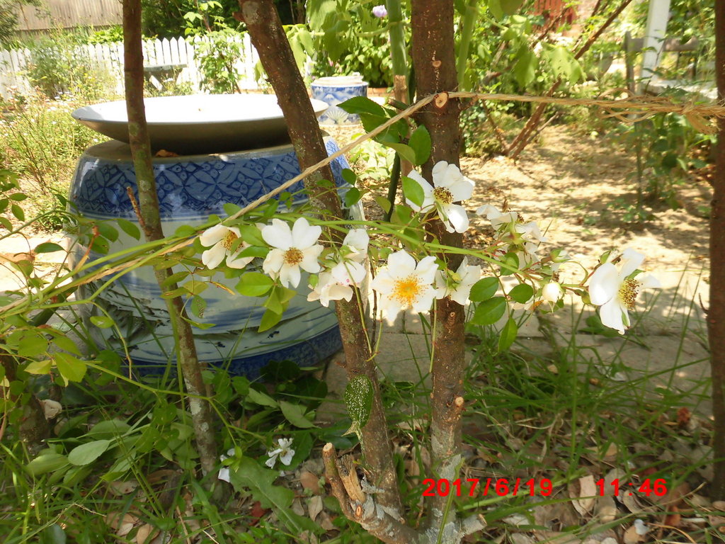 斑入りまさきの根元に植えたポールズヒマラヤンムスク