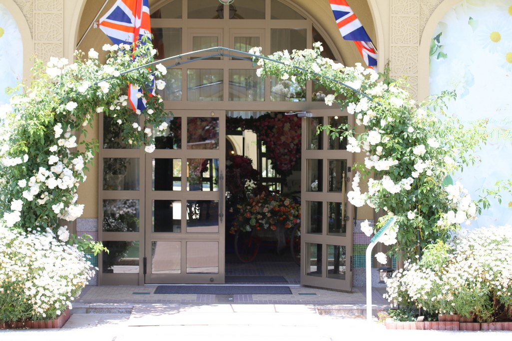 レオマワールドのバラ園のホワイトガーデンがこのアーチの手前にあります。 プールのような四角い池?の周りに白バラと白い草花が植わっています。