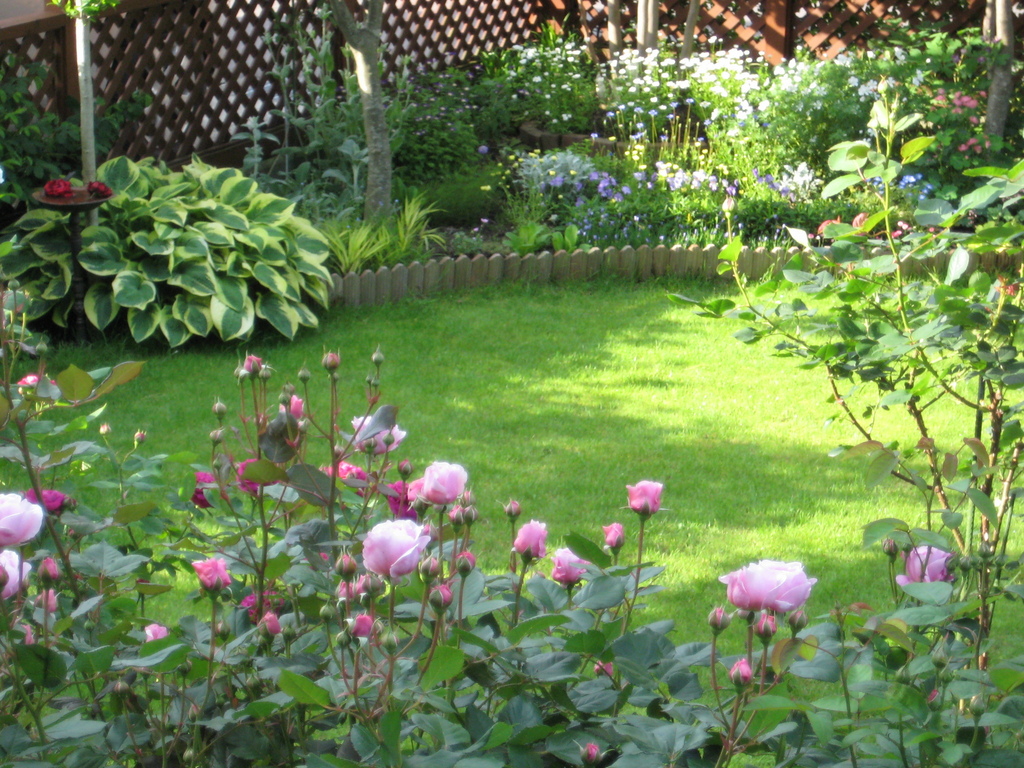素敵なお庭ですね。ピンクの薔薇がよく咲いて、ギボウシも見事に育ってますね。正面のブルー&ホワイトの小花の花壇もとても可愛いです!