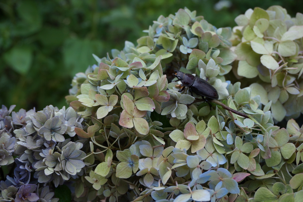 クワガタの女の子が遊びに来ていました。 アジサイは少し早めに剪定したのですが、部屋の中でドライにして楽しんでします。
