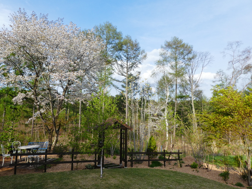 アーチが完成した5月中旬に、たまたま我が家の敷地にあった山桜が満開。 桜の所までが我が家の庭で、モミジ 朴木 シラカバなどを植えました。
