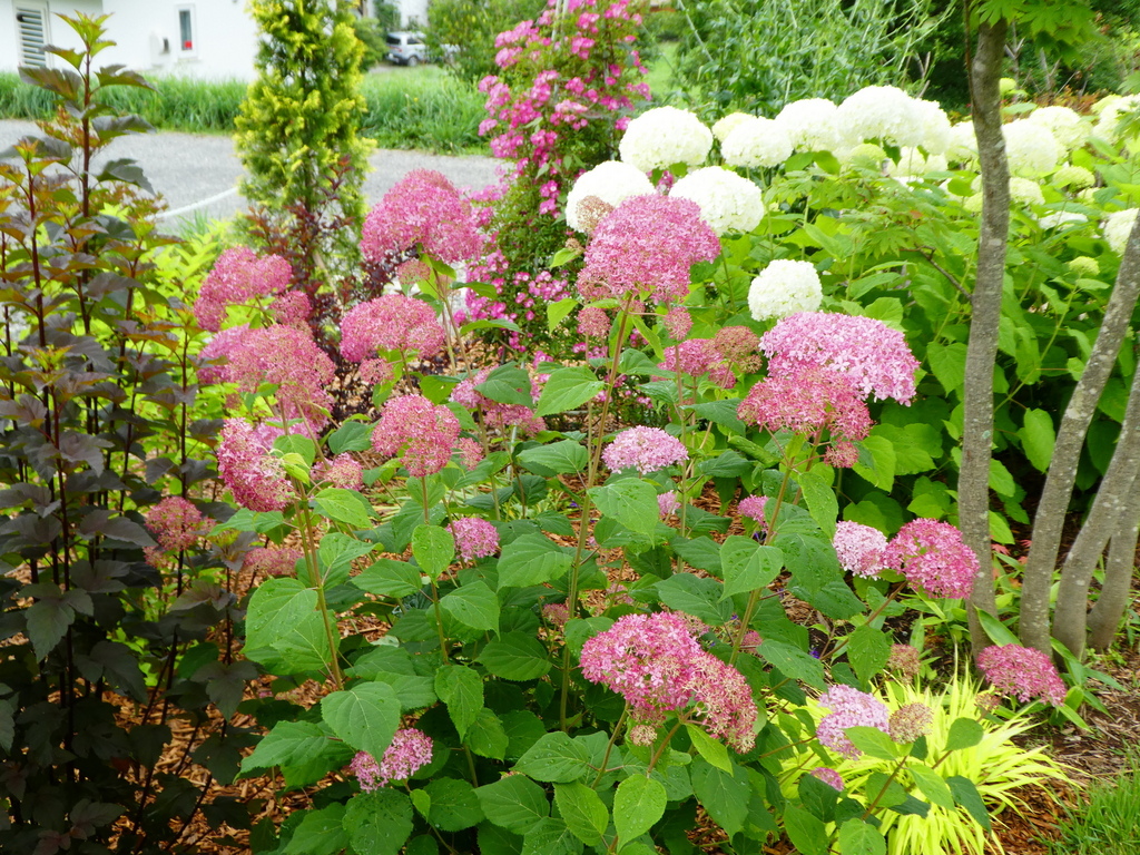 ピンクアナベルはとても華やかですね。 奥に見えるバラは 安曇野です。