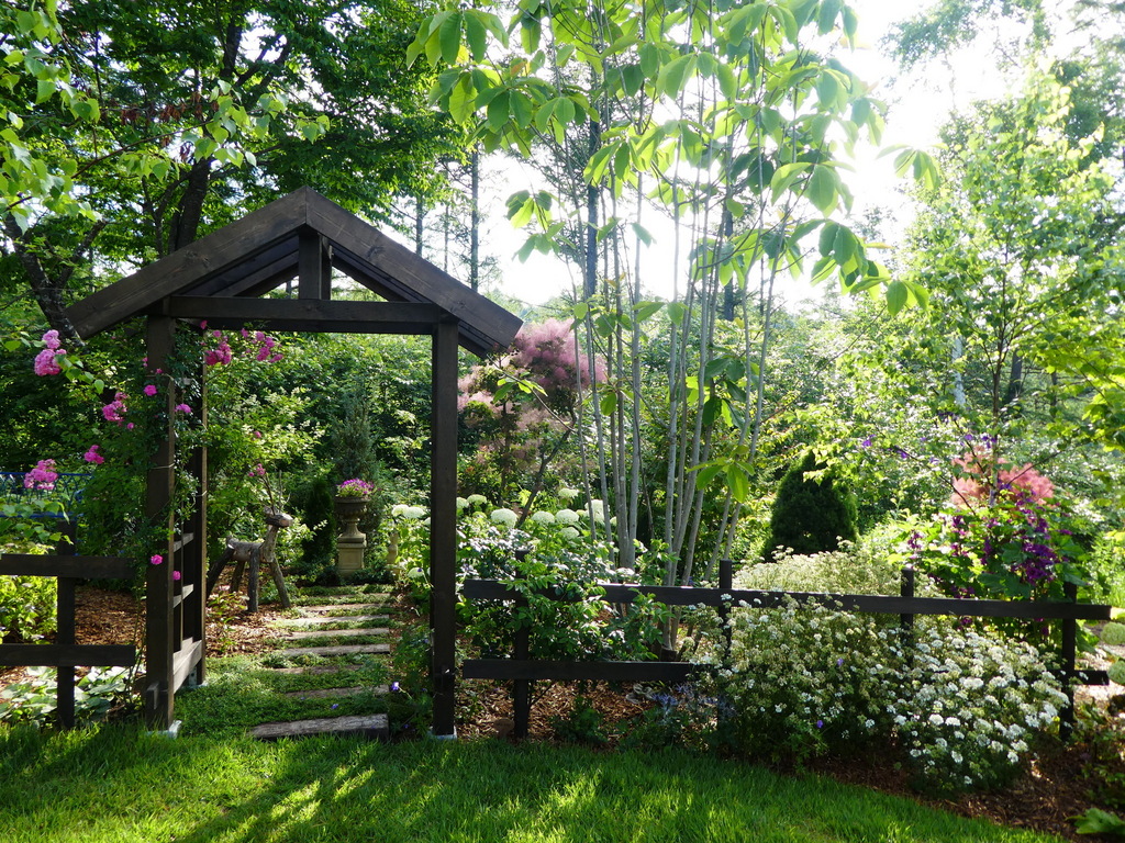 ナチュラルなアーチの奥に色々の種類の木々・お花 素敵です!