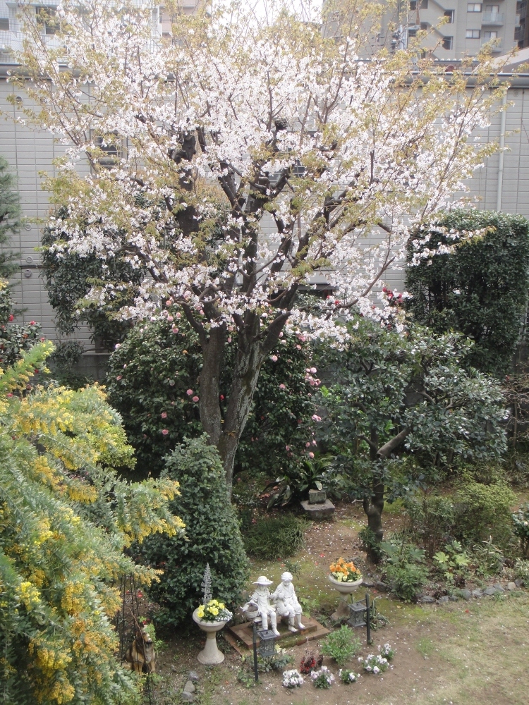 立派な山桜!いい眺めです。手前のミモザもきれいですね。いろいろな花木がのびのび育つ広いお庭羨ましいです。