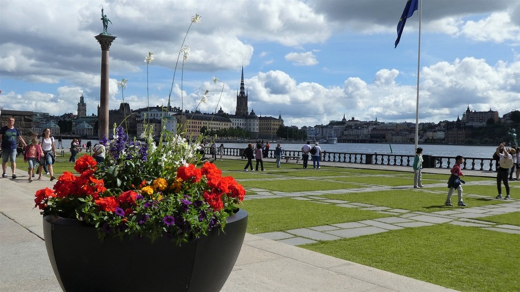 市庁舎の南にあるリッダー湾に面した所こんな寄せ植えがありました。 向こうに見えるのは、大聖堂:その近くに王宮・ノーベル博物館があります。