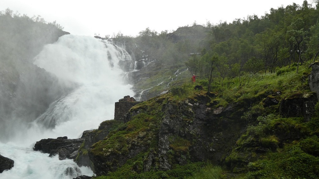 この滝の周りに高山植物の花が咲いてますが、近寄れません。フロム山岳鉄道でフロムに向かう途中です。ここに泊まると、妖精クルドラが現れました。