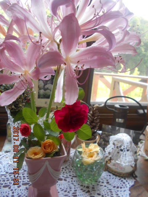 ネリネとエジンバラ もう薔薇は小さくて、涼しそうなネリネに圧倒されますね。