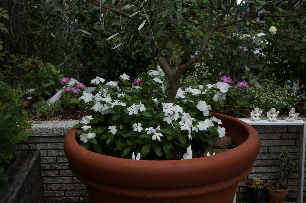 昨年植えていたこぼれ種のニチニチソウがあちこちで咲いています。 オリーブの株元にもたくさん!
