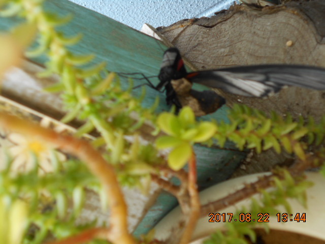 玄関軒下の多肉植物のそばで、蝶の脱皮姿を発見しました。