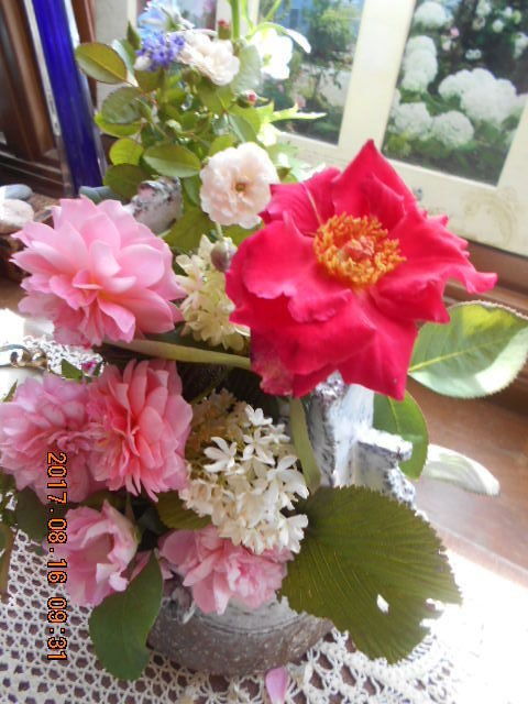 器を和風にレースも紅茶で染めて、秋色に 薔薇はラ・カンパネラオオデマリ グリーンアイス