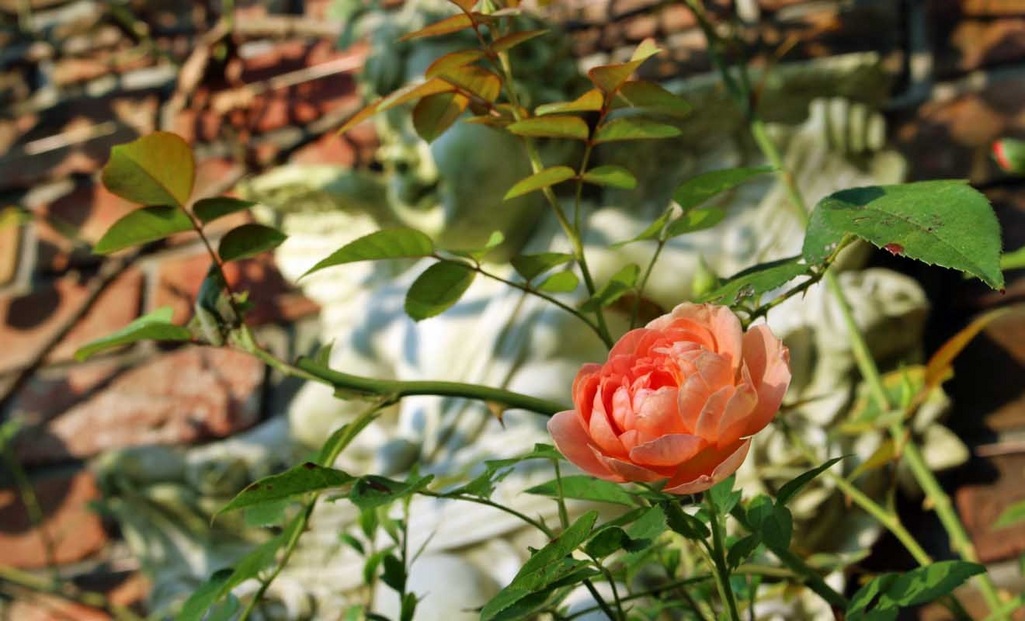 ツルバラとして育てているパットオースチン・・レンガ塀のエンジェルを背景に