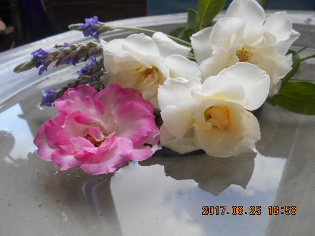 可哀想ぐらいひ弱に咲いていました。この夏の暑さでレースフラワーもぐったり! 水盤に夏の空が映ってます