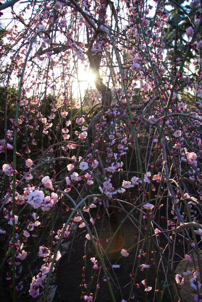 あ~~、枝の間から、光が漏れ輝いて、しだれ梅をいっそう魅力的にしています~♪すばらしい~♪