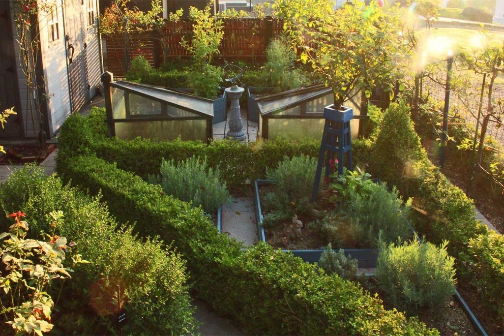 狭い三角形の土地で使いにくいところでしたが、イギリスでみたポタジェを参考に、年代の違うスタイルを混合で作った庭です。南東向きで朝日のあたる時間がもっとも美しく見えます・・