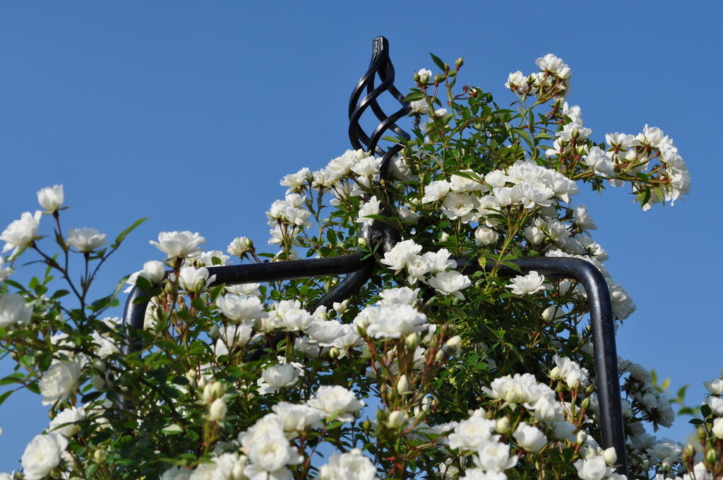 手作りオベリスク!?素晴らしい♡私も以前、お友達に欲しいデザインのアイアンフェンスを頼んで作ってもらったのですが、宝ものです!白いバラが青空に映えますね!