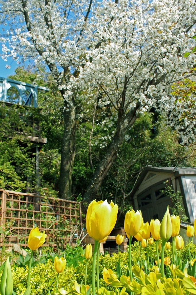 ヤマザクラとチューリップが春の訪れを告げます。黄色い色は元気の出る春の色です。