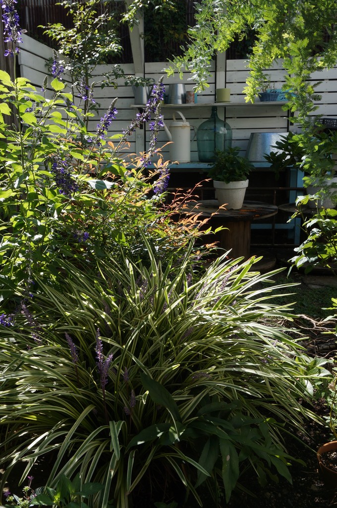 セージの明るい緑の葉、ヤブランの斑入りの葉、そしてナンテンの赤みを帯びた葉に光がさして、陰になったガーデン雑貨を飾った棚を背景に、とても素敵な構図の素晴らしい写真になっていますね。