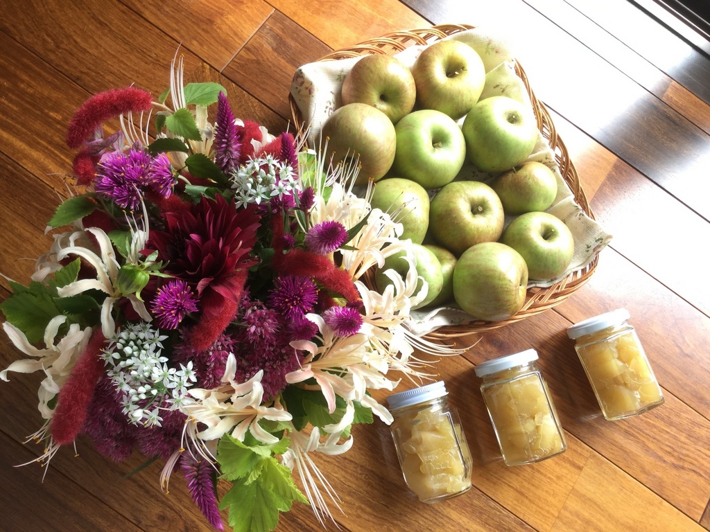 フジの枝にテッポウムシが侵入していたので、たくさん青い実のついた枝を、泣く泣く落とさねばなりませんでした でも一足早くおいしいリンゴジャムができました