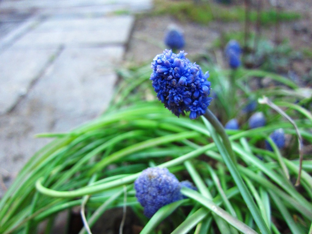 何年も前から植えっぱなしのムスカリ。筑紫のようににょきにょき出てきてちょっと変わった花を咲かせますが、名前を忘れてしまいました。