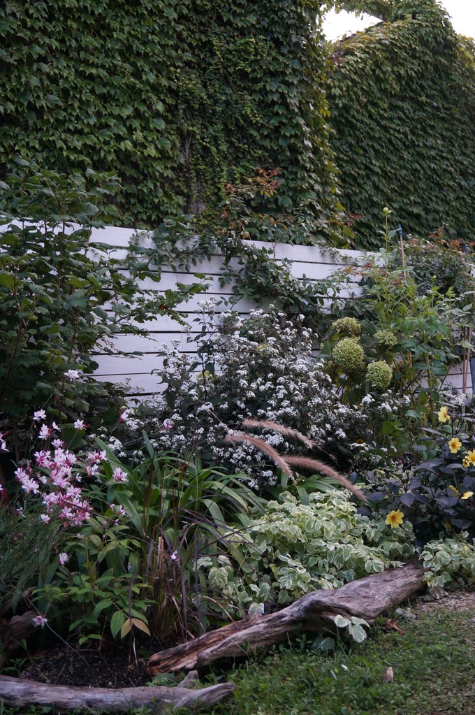 白いフェンスが植物を浮かび上がらせてくれて、いいステージになっていますね。フェンスの上の緑の壁がまたいいですね。