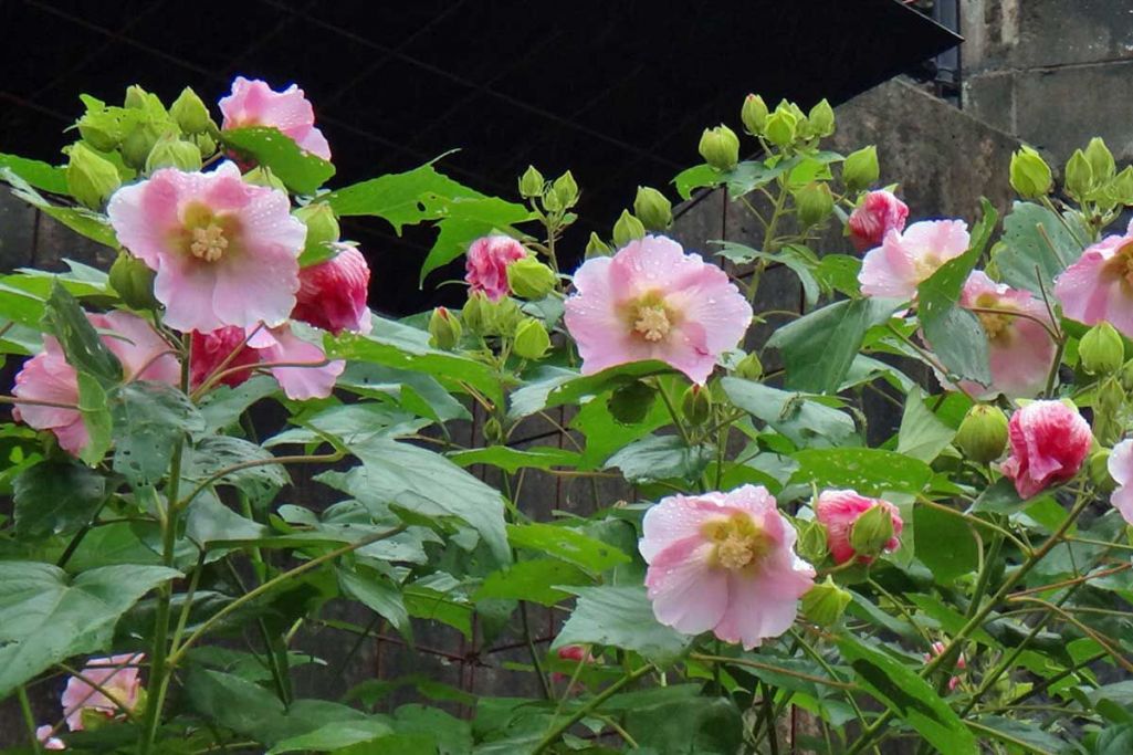 花は朝開いて夕方しぼむ一日花。毎日害虫のガが卵を産みにやってきて、ちょっと目を離すと葉っぱは穴だらけになりますが、花は頑張って咲かせます。