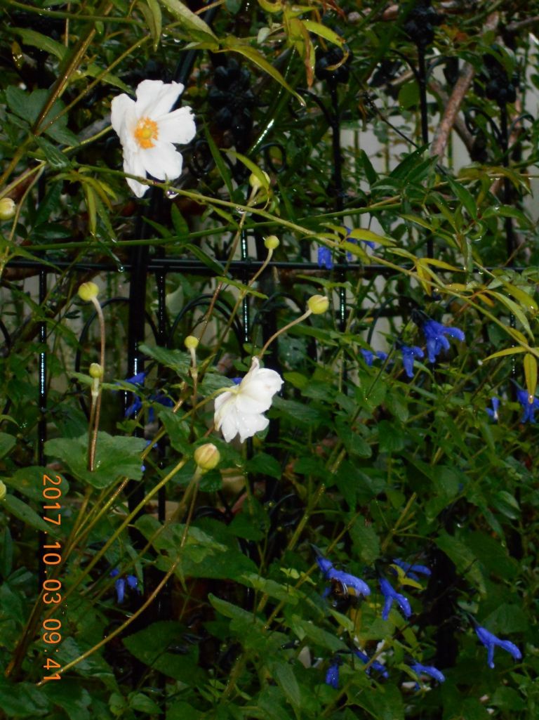 留守の間に咲いていてくれたシュウメイギク 雨に打たれながらも・・