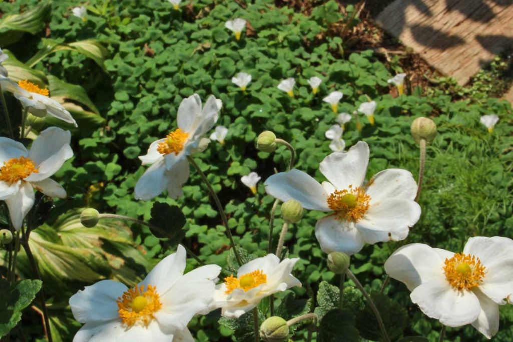 10月になって急に冬のグランドカバーにしている白いオキザリスが葉を広げて花を咲かせ始めました。白い花の競演です。オキザリスはさみしい冬の庭でずっと白い花を咲かせています。寒い季節で曇った日は花を広げないせいか、一つの花がずいぶん長くもつようです。
