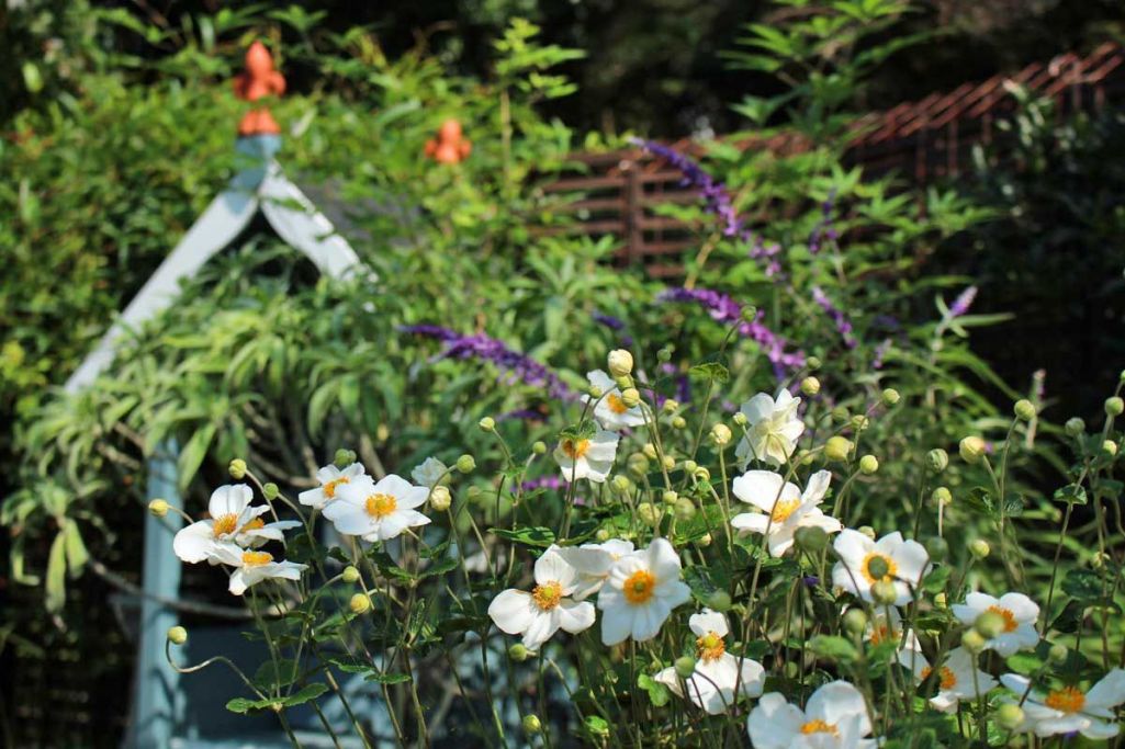 背景はボーダー花壇のアーバーシート(屋根付きベンチ)とアメジストセージです。アーバーシートの両側には予想以上に大きくなったエキウム。セイヨウニンジンボクは終って枝を剪定しています。一番奥にはハーデンベルギアのツルが茂っています。