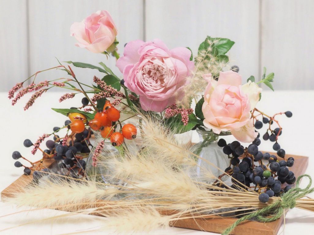 添える素材で素敵な秋の収穫を感じ、メインのバラが