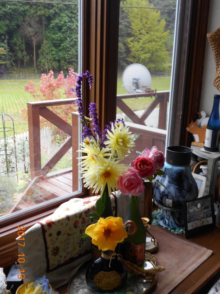 メイプルの赤、銀杏が少し黄色く 昨日のお花と肌寒さを感じての朝の風景