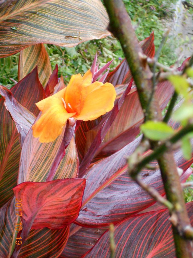 土手にズラリ植え込んだ銅葉カンナ、この時期でも今年は何故か咲いてます。