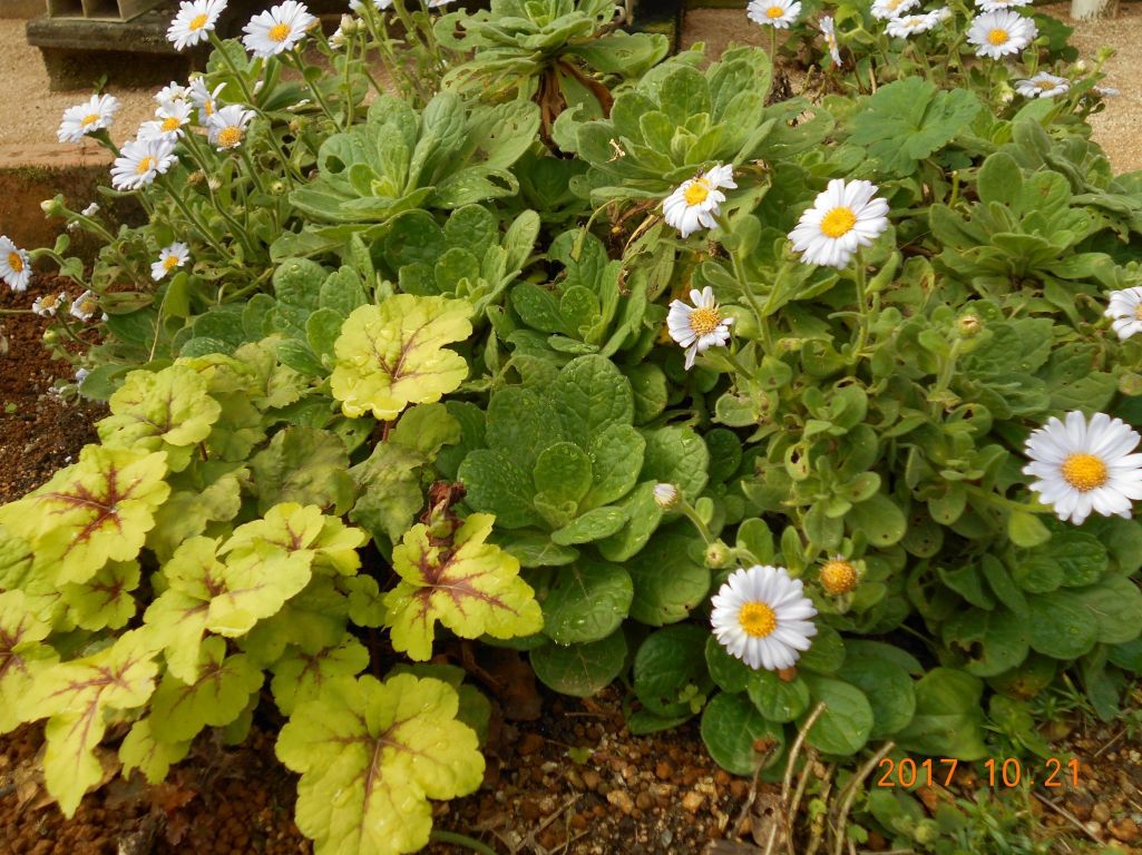 白い菊とヒューケラの色があっていて可愛い風景ですね~♡素朴な感じが良いです♡