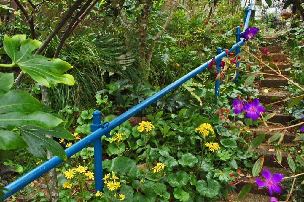 メインガーデンとポタジェをつなぐ階段のある細道の写真です。ギャラリーへのアップは初めてだと思います。ブルーに塗った手すりに沿って咲いているツワブキの花です。右上の隅にはバラのアーチがちょっと写っています。台風の塩風で傷んだノボタンですが、また花を咲かせています。でも明日また台風が・・・
