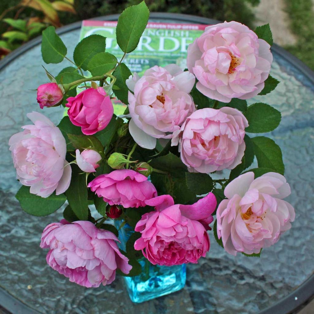 イングリッシュローズのバックのガラスが輝いて素敵なアレンジですね!