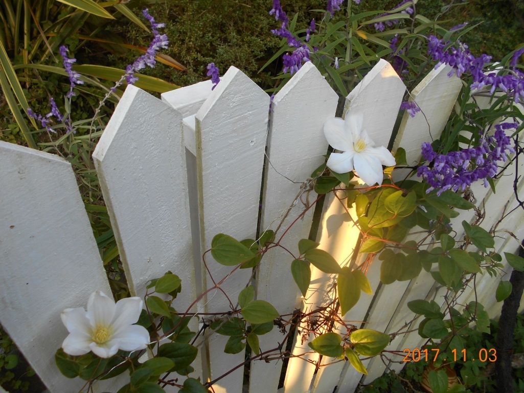 四季咲きクレマチスとメキシカンセージが咲く素敵なコラボですね。
