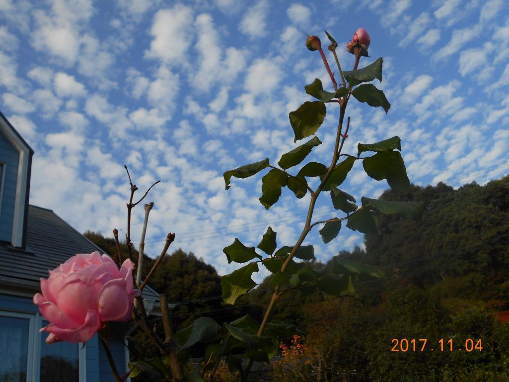 秋晴れの鰯雲に伸び伸びとナエマが・・ライラックに絡ませて・・