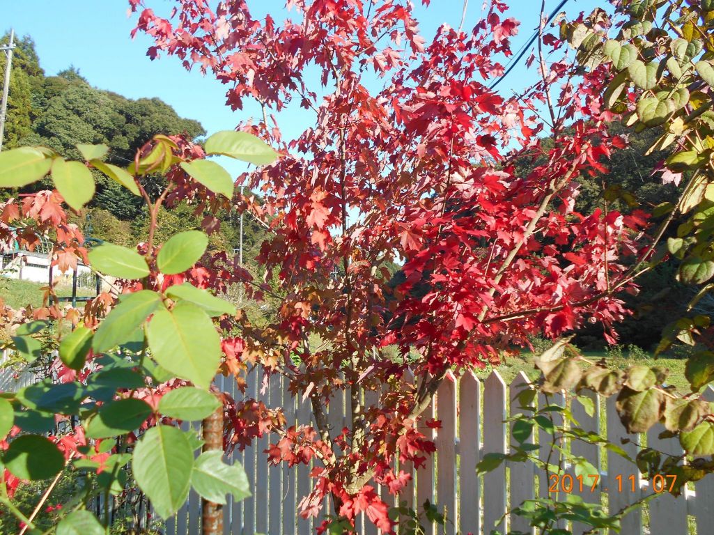 白いフェンスと真っ赤な紅葉!きれいですね~( *´艸`)♡ 私もメイプルツリーを買いましたが、どうやらこちらでは紅葉するまえに落葉するようです^^;