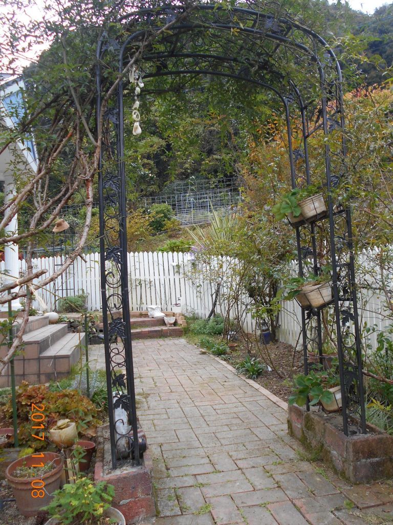 アーチの下から白もっこう薔薇と黄色もっこう薔薇