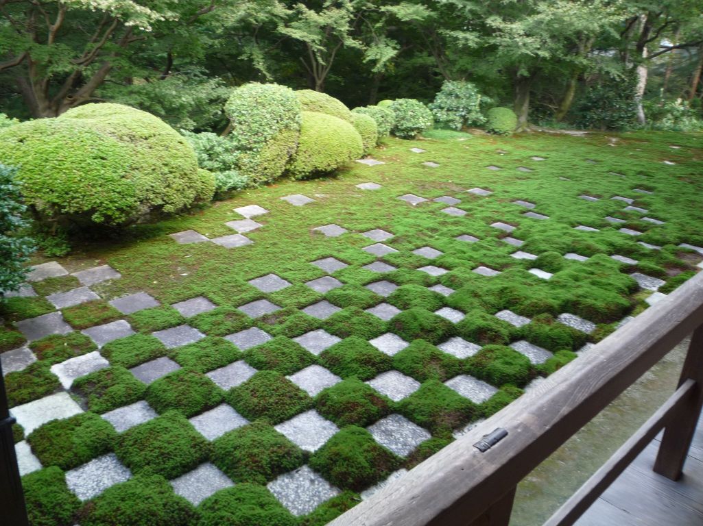 市松模様は幾何学的で西洋的なモダンな印象で西洋の邸宅の床などで見ますが、桂離宮の襖など古い日本の建築にもあり、古くから好まれてきたデザインのようですね。ここでは石板と苔ですが、うちの庭でもほんの一部ですが、芝生の通路に市松模様で踏み石を配置してみています。