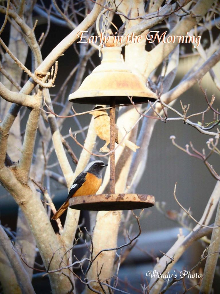 ジョウビタキ、我が家の庭にも冬はよく来て、庭仕事をしている私たちを見ています。レストランの今朝のメニューはなんでしょうか・・