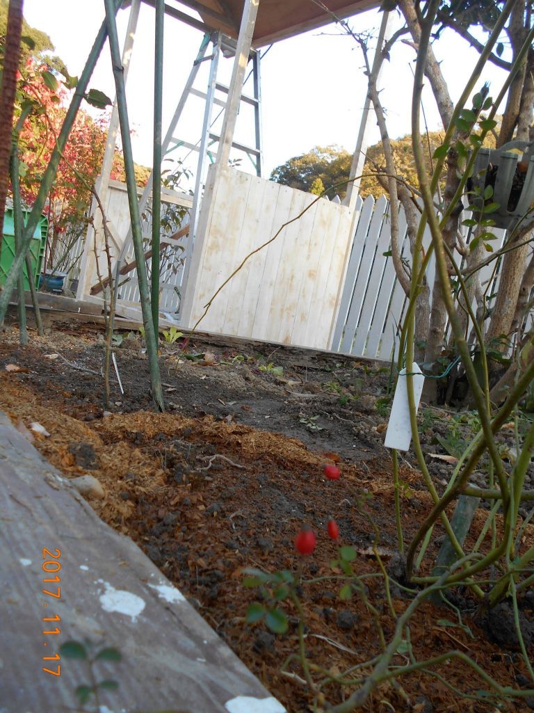 ロココ、ポールズヒマラヤンムスク、木立アイスバーグを建築中のガゼボの近くロウバイの場所へ移植しました。