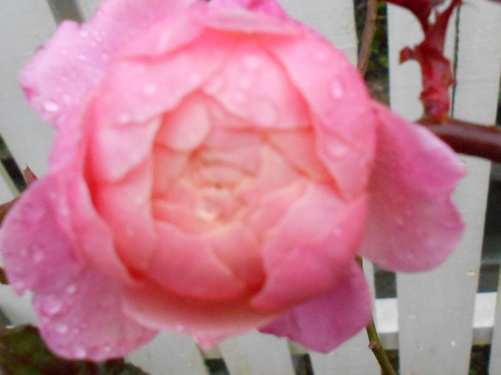 冷たい雨に濡れている姿を見ると可哀想になりますね。蕾のついた鉢植えの小さなバラ苗を縁側にもってきたら、綺麗な花を一輪咲かせてくれました。