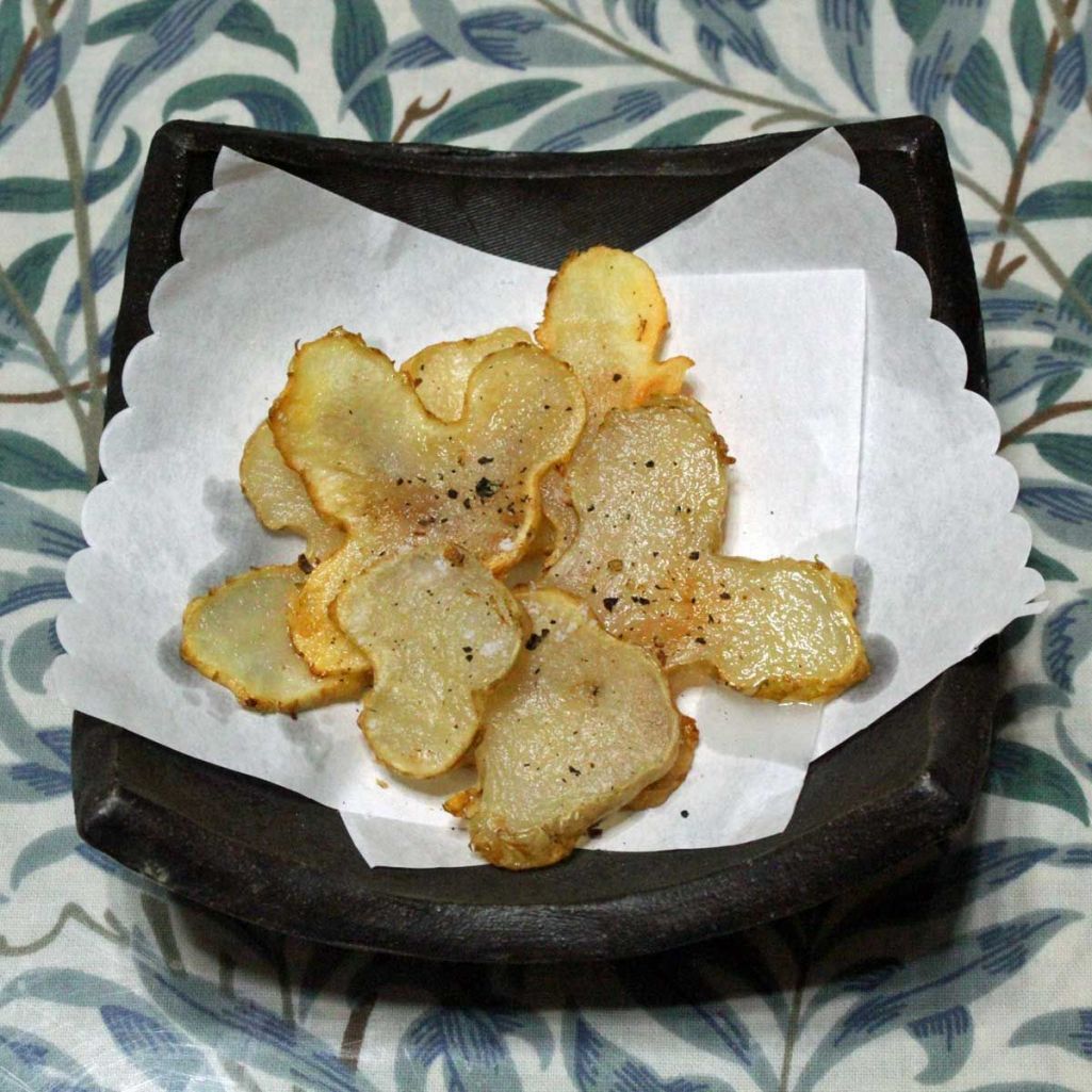 アザミのような大きな花の蕾を食べるグローブアーティチョークと風味が似ていることから同じアーティチョークという名前がついていますが、こちらはイモです。黄色い菊の花に似た花を咲かせるのでキクイモとも呼ばれます。いっぺんに沢山頂くとお通じが良くなりすぎます(笑)。あまり病害虫もなくて育てやすい野菜ですが、芋が残って広がりすぎるおそれがあるようで、半分土に埋めたフェルトのコンテナで育てました。