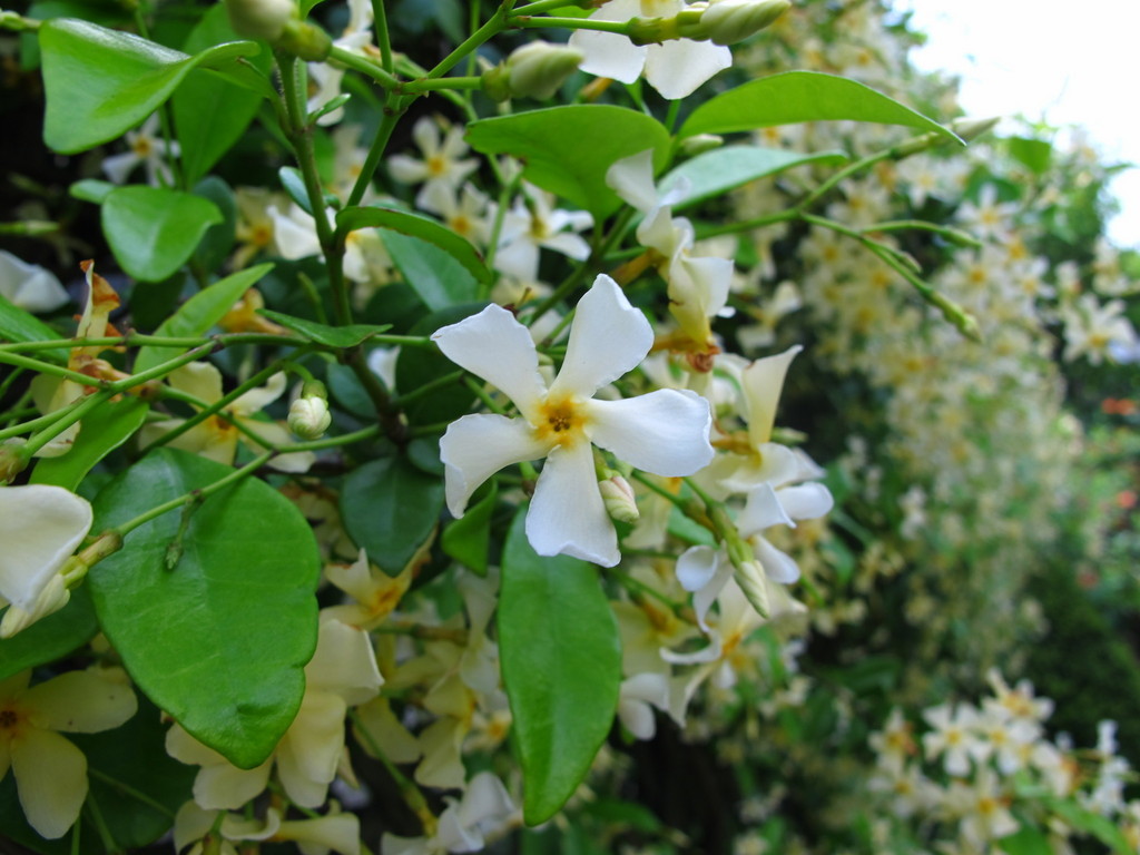 毎年夏にはいっぱいのテイカカヅラがトレリスに絡まってます。