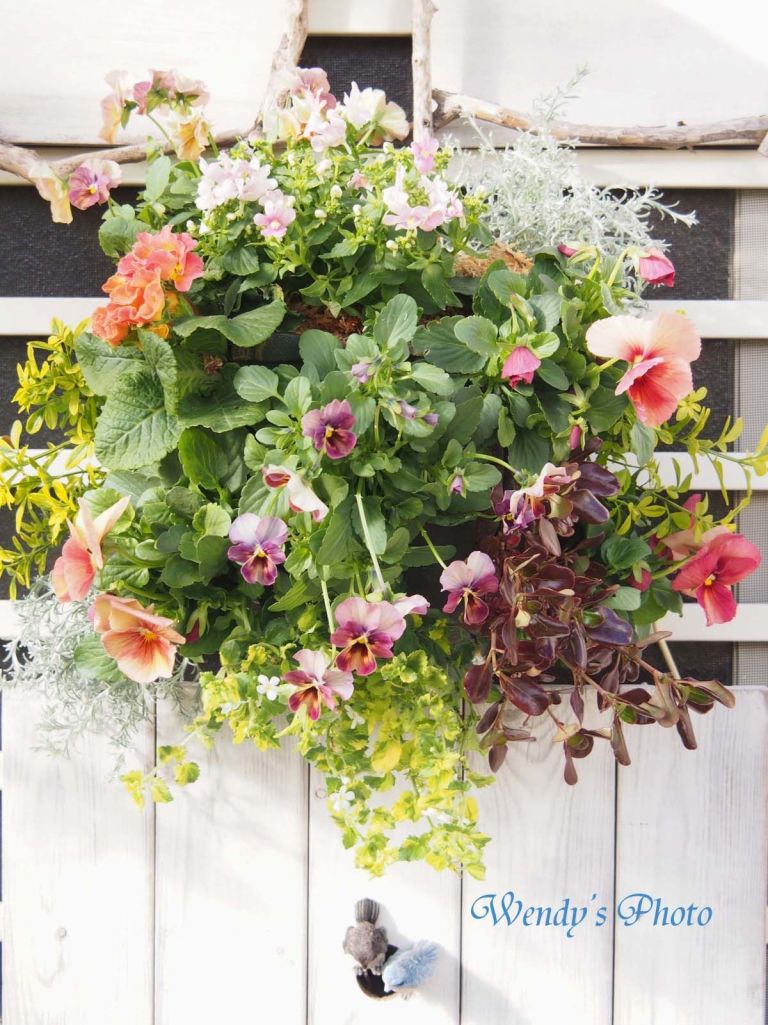 首がスーッとのびたビオラ、銅葉のコプロスマ、花の配色とバランスがとても素敵です。春まで冬の庭が華やかですね。