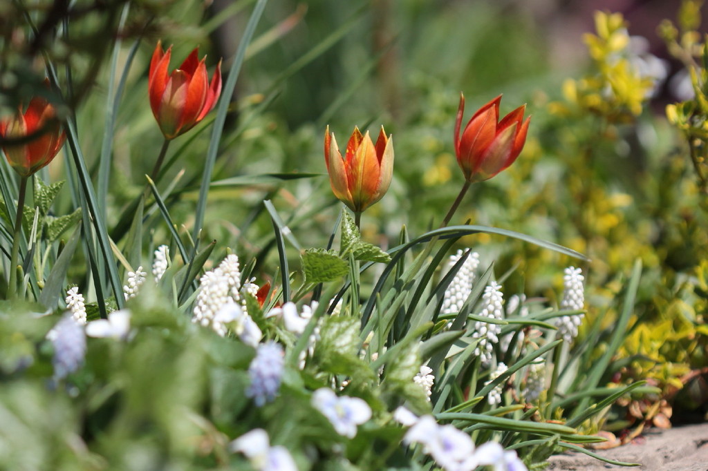 暖かい光を浴びて、どのお花も生き生きしていますね。オレンジ色のチューリップ、とてもキュートです。