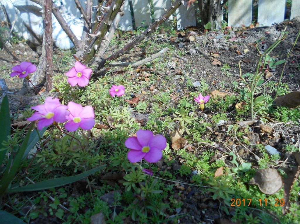 薔薇の根元に可愛いピンクのお花が今日の暖かさが嬉しそう