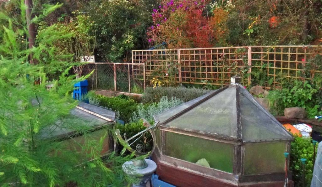 左はまだ青々と茂っているアスパラガス、フレームの中にはミニゴボウが育っています。アスパラは間もなく枝葉が枯れ、ミニゴボウは収穫の時期を迎えます。