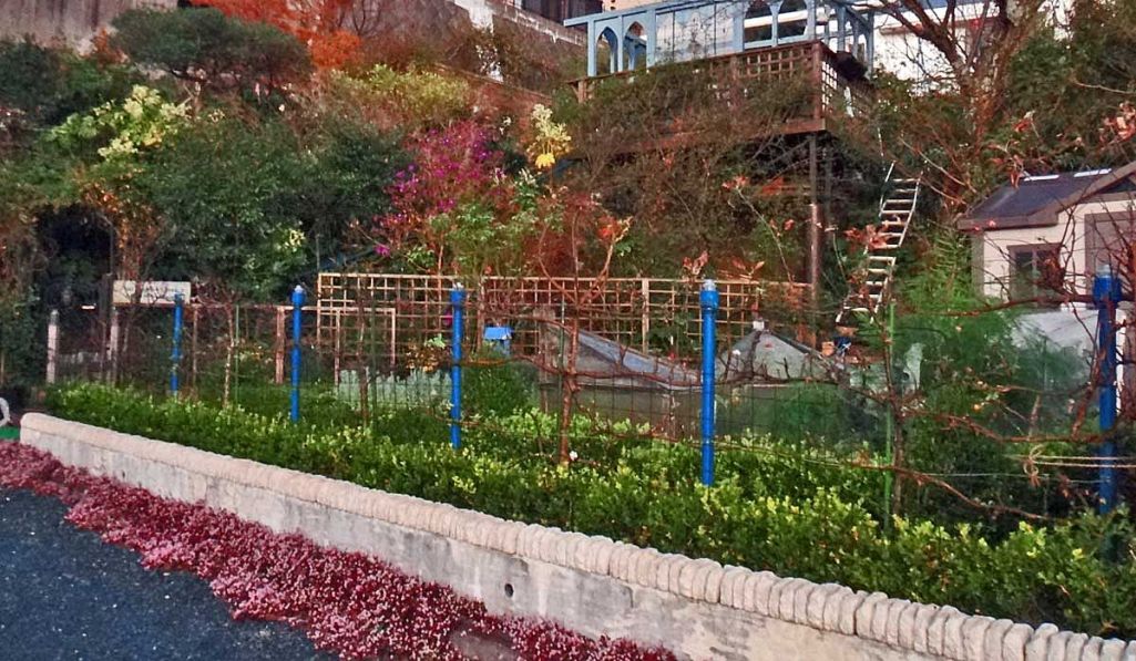 メインガーデンから降りていく階段をみて、かなりの高低差にびっくりです。ポタジェのフレームが目を引きます。ポイントカラーは青でまとまっているのですね。素敵です。