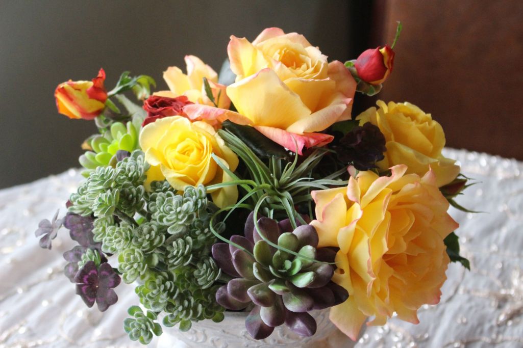 晩秋の庭に咲く薔薇でアレンジをする。